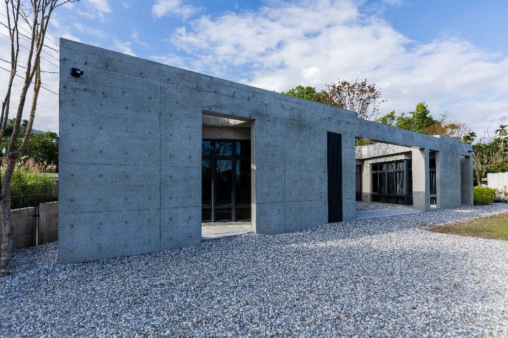 這棟建築以簡約的清水模筆觸,勾勒出質樸而純粹的輪廓。沉穩的灰色牆面與周遭翠綠的山巒、林木交織,宛如大地自然生長的幾何。室內外界限在光影流動間消融,實現了與環境共生的靜謐之美,讓生活歸於原始的寧靜。