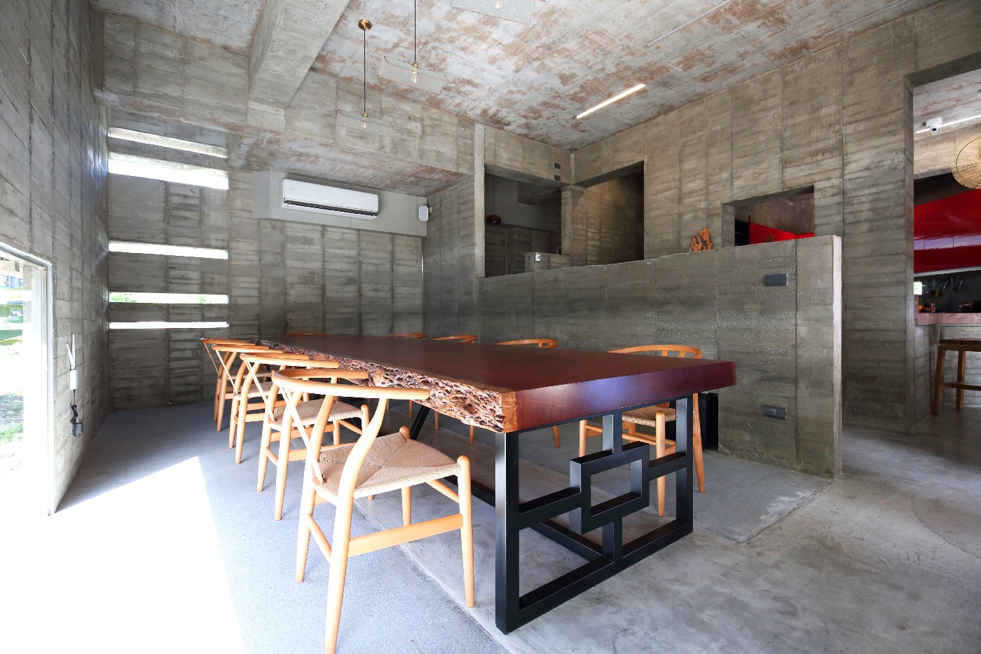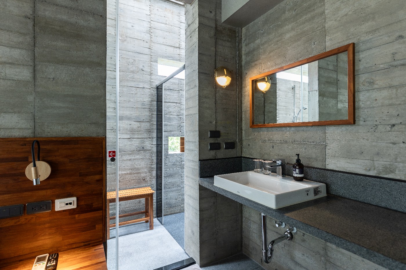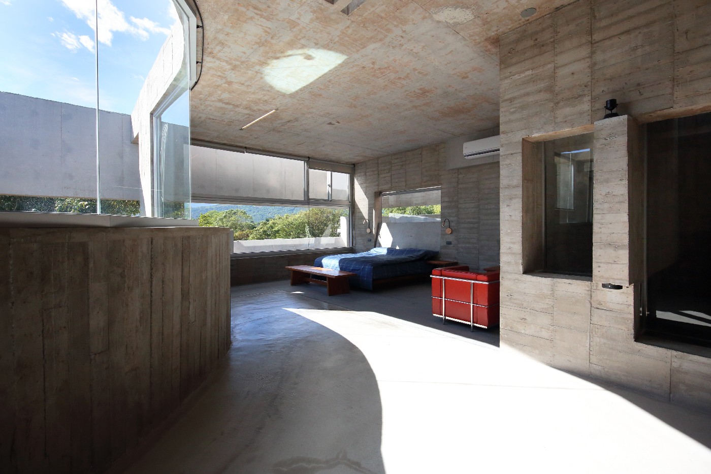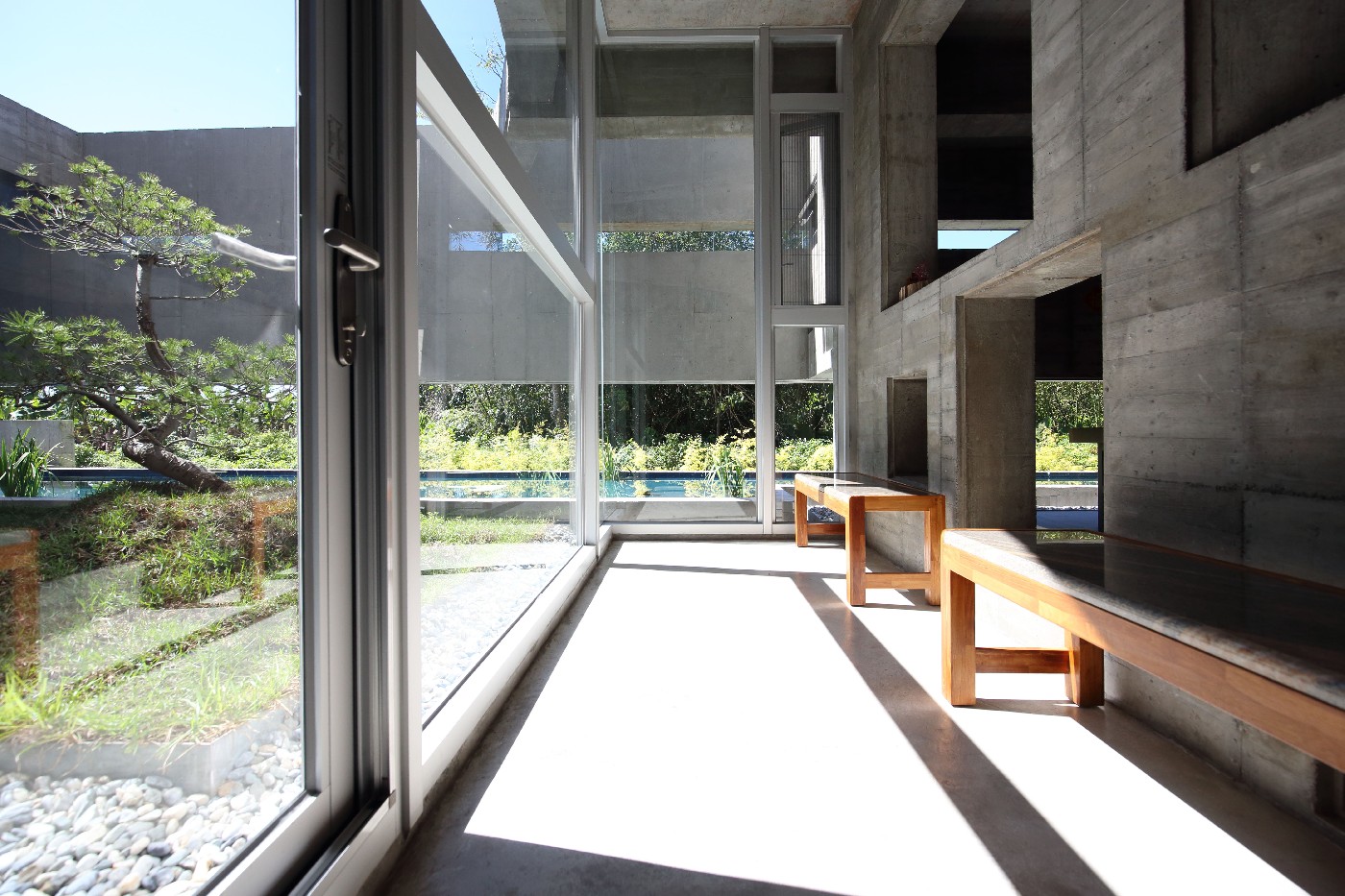 清水模的灰色,搭配大自然色調家具,展現了差異性的協調。 每個轉角,都是一處光景,透過大開窗景追逐自然四季的變化,感受光與影的共舞。